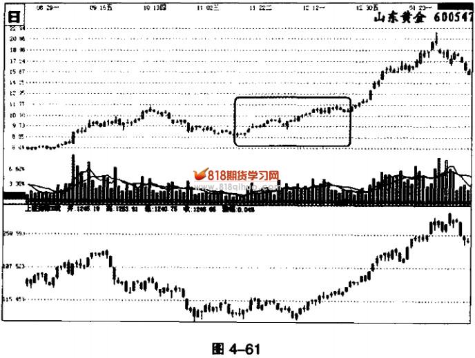 当投资者发现了龙头股是谁以后,千万不能只认为龙头股的波动是独立的,它的波动将会在很大程度上影响指数与其他个股。因为操作该股的资金属于主流资金,所以,这些资金的操作方向将会很大程度上对其他个股起到促进的作用,能够带动的个股数量越多,那么这一板块中的个股做多走势对指数起到的促进性作用越大。图中可以看到,山东黄金形成了一个非常标准的箱体震荡底部,股价在一个较小的范围内强势震荡上行,龙头股的底部是震荡底,因此导致了指数也在同一时期形成了相同的底部。指数藤荡底部的形成意味着什么呢?