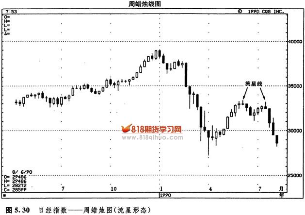在图5.28中,显示了2个流星形态,在它们的身后,均出现了明显的价格下跌过程。在图5.29中,该流星形态同时也标志着市场向上试探1989年10月至11月期间的高点的历史水平的失败。雪上加霜的险恶征兆!在图5.30中,有一对流星形态。每一个流星形态都结束了先前的上涨行情。