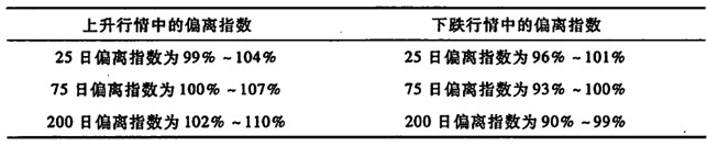 很多使用计算机软件的交易者都会尝试寻找造用的移动平均线,我们也可以考虑寻找适合自己的偏离指数线。为举例说明,这里要引用日本人在20世纪80年代做过的一项研究,即用偏离指数来判定日经指数是否处于相对极端(超卖、超买)状况。这项研究发现的状况可见下表,其中所有数值都在2个标准差之内,其发生概率为95%: