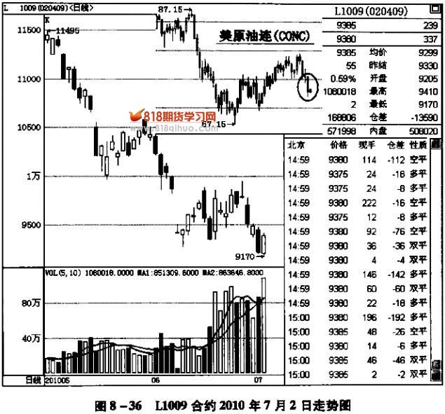 在图8-36中,您来说一下L10Q9合约在2010年7月初的走势有什么样的技术特征。