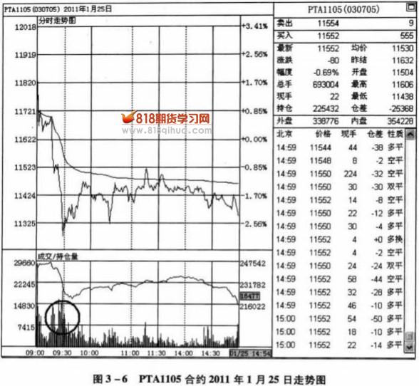 PTA1105合约2011年1月25日开盘之后,价格出现了快速回落的走势,虽然下跌的周期并不是很长,整体下跌幅度也不是太大,但其间形成的完美量价配合形态还是值得关注的。