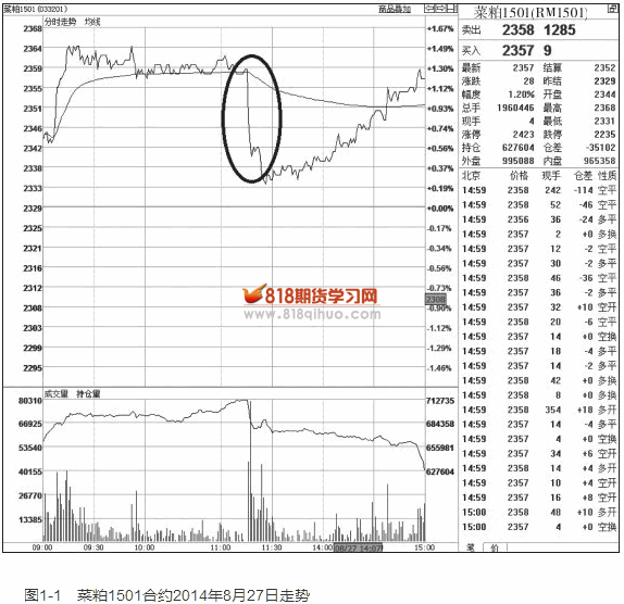 在图1-1中,菜粕1501合约在2014年8月27日开盘之后,一直保持着多头波动状态(分时线在均价线上方),而后在没有任何下跌征兆的情况下,价格突然放量快速下跌,这样的走势就称为突发性的急速涨跌走势。