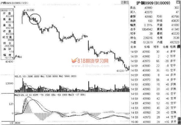 1.价格开盘后略做上冲便连续下跌并有效跌破首根K线,这说明当天的市场气氛有较大偏空的可能;