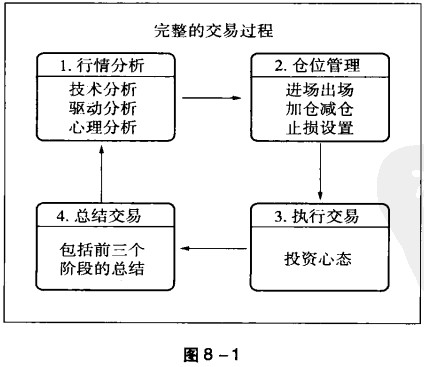 尽管对很多投资者来说,这个过程已经相当耗费精力,但这并不是交易的全部,这仅仅是完整交易过程的第一步。完整的交易过程还包括仓位管理、执行交易、总结交易三个阶段。如图8-1所示。