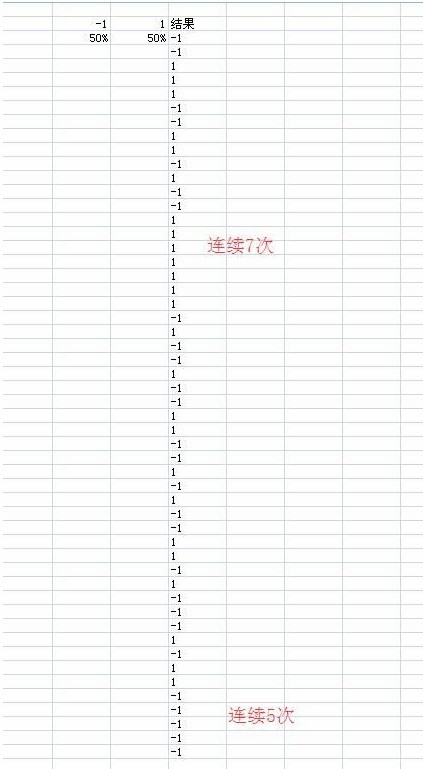 连续50次随机测试,在成功率50%情况下,有连续7次正,连续5次负是可能出现的。有很多人总以为连续两三次正之后是会出现负。如果你给出连续7次正或者连续5次负的话,别人肯定不会认为这是50%成功率。