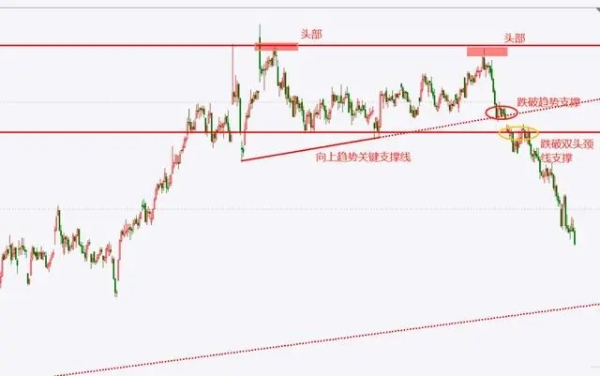 2)市场心理:图中沿上升趋势重要支撑线的震荡上涨表明买家没有足够的力量将价格推高。震荡上升的结构被突破后,可以确定双头形态的第二个头部确立,这表明该品种变得更加疲软。同样,买方没有办法将价格推高,而卖方力量正在慢慢加强。最终,颈线的突破是一个卖出信号,盈利目标可设置在突破点到下行方向所预测的形态高度。强劲的看跌蜡烛图(实体线)证实了先前的卖出信号,而盈利目标恰好处于汇合区。