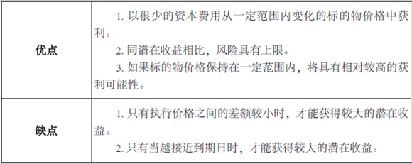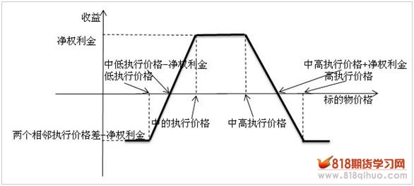 买入铁鹰式期权组合包括买入一份具有低执行价格的虚值看跌期权,出售一份中间价位较低执行价格的虚值看跌期权,出售一份中间价位较高执行价格的虚值看涨期权,同时买入一份较高执行价格的虚值看涨期权。易知,当期货价格跌至低执行价格以下或高于高执行价格以上时,我们将遭受最大损失:中高执行价格-中低执行价格-净权利金;当期货价格位于中低执行价格与中高执行价格之间任一价位时,我们将获得最大收益,即净权利金。应当注意,此组合具有两个益损平衡点。其中,向下益损平衡点为:中低执行价格-净权利金;向上益损平衡点为:中高执行价格+净权利金。