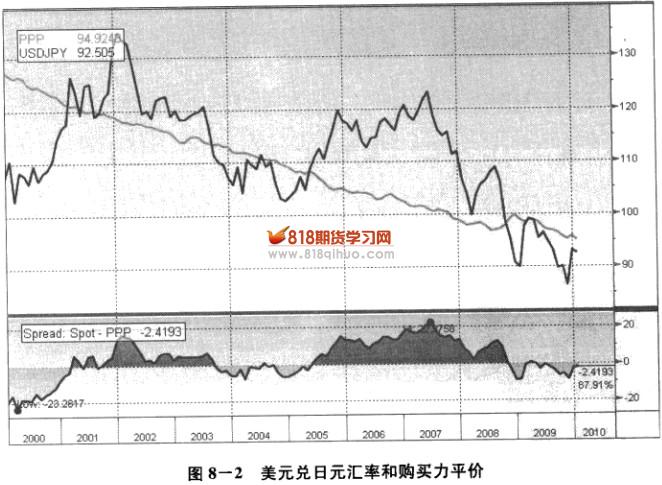 在外汇市场中,心理因素也对汇价中短期走势发生了重要的影响。购买力平价不完全决定汇价,价值规律在外汇交易中不为实用。古典经济学理论中的“平衡”说的是一种资源配置和盈利的平衡,但是这个理论在外汇市场中不实用。首先,外汇是个零和游戏,“平衡”虽然在理论上说得通,但是这种“平衡”的前提从来没有在任何一个外汇市场中出现过,这个理论也就不适宜在外汇市场中应用。由于买方和卖方都想从市场参与中谋取更多的利益,就必然对汇价施加影响。再加上外汇市场含有较多的投机成分,必然会加剧其价格的波动幅度和波动频率,这样频繁的大幅度波动往往会歪曲供求曲线,使得以供求曲线做判断依据的投资者做出歪曲的理解和盲目的市场行为,造成对市场方向判断失误的增多。外汇市场中常常可以看到汇价长期飘升或者下跌不回调,也就是汇价围绕购买力的波动周期太长,价格长期偏离价值,如图8-1至图8-7所示。其实,购买力平价没有考虑到货币主权的风险问题,所以汇价偏离购买力平价(货币价值的代表性指标)还未必全是由交易者心理引起的,除了交易者情绪之外还存在其他一些因素,但是我们本章主要研究的是交易者心理对汇价偏离价值的影响。
