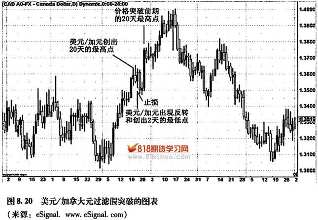 图8.20是这个策略的另一个例子。美元/加拿大元的日线图显示了,在4月21日,货币对创出了20天的新高点1.3636。这意味着,它成为我们的观察目标。我们等待着,货币对出现2天的新低点,然后在3天内出现反弹,超过了前期20天的高点1.3636。我
