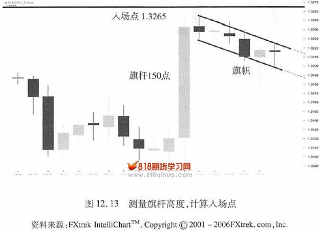 旗形的交易方式与三角旗形的交易方式类似。首先,我们要测量旗杆。本例中,旗杆从1.3100开始,顶点约为1.3250,整个高度约150点(见图12.13)。我们的入场点将位于旗杆之上的一个点位,离旗杆顶点的距离将等于旗杆高度的10%。由于150点的10%等于15点,所以我们将把入场单设在1.3265,这个点高于旗杆顶点15个点。