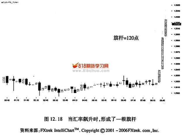 就像任何一个形态、策略或者技术一样,旗形和三角旗形也不是百分百可靠的。这里就有一个出现在欧元/美元的10分钟图上的旗形。我们可以从图上看到,汇率一直在横向整理,之后突然出现急剧的上涨,创造出了一根旗杆(见图12.18)。旗杆从约1.2820的价位一直延长到1.2940,高度有120点。