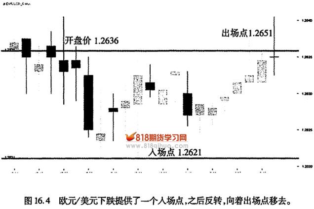 这里还有另一个例子:在美国东部时间下午5点,汇率的开盘价是1.2636(见图16.4)。交易者在开盘价以上15点的1.2651设下一张卖出订单,在开盘价以下15点的1.2621设下一张买入订单。买入订单在1.2621被执行,我们立即取消设在1.2651的卖出订单。