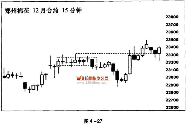 从图4-27中可以看到,髙开上冲行情在平台整理后呈现了疲软特征,后面形成了一小段分时持续下跌行情。通常来说,多头动能一旦衰竭,就没有体力再返回并突破前期高点。该日后续行情出现快速回升,不仅突破了疲软性的整理平台,并且还突破了前期髙点,这种情况说明趋势波段已经没有多少惯性了,后面的市场走势极有可能进人更长时间的整理期,或者出现大级别反弹。此时,分时交易应该停止下来,进行一段时间的市场观察,—直到行情趋势完全明朗,交易机会得到确认为止。