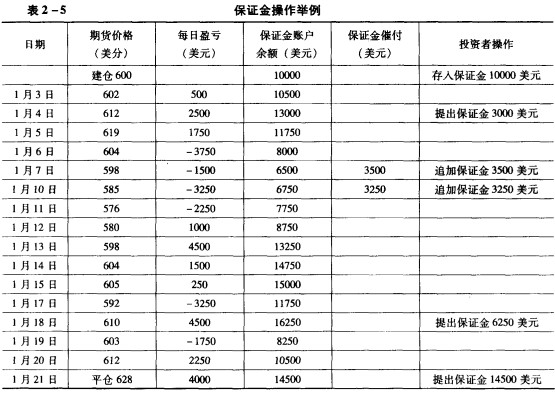 从上述例子中可以看到,1月4日和1月18日时,投资者保证金账户中的金额高于初始保证金水平,投资者有权利提出资金,但保证金账户内的金额仍需保持在初始保证金水平。而1月7日和1月10日,由于投资者保证金账户中的金额低于了维持保证金水平,投资者需要追加保证金,使保证金金额保持在初始保证金水平。而在保证金账户的金额髙于7500美元而低于1万美元时,投资者不需要追加保证金,同时,在保证金账户的金额髙于1万美元时,投资者也可以不提出高于k始保证金水平的那部分金额。最后,这个投资者盈利:3000+6250+14500-10000-3500-3250=7000美元。