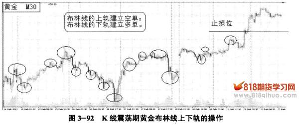 (1)关于"K线震荡期布林线上下轨"理论:震荡操作法。布林线的上轨建立空单,布林线的下轨建立多单,如图3-92、图3-93所示。