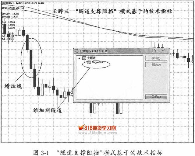 维加斯隧道很早之前就在欧美交易界小规模传播,此后有位署名为维加斯的交易者将此工具融人到自己的策略中,这才获得更大范围的传播,不过目前知道维加斯隧道的交易者还是极少数,所以这个工具的有效性在未来十来年还是有很高保证的。王牌三"隧道支撑阻挡"模式主要是基于维加斯隧道的运用,所谓的维加斯隧道也就是参数为144和169的两条移动平均线,其中144恰好是菲波纳奇神奇数列中的数字,而169的平方根13也是菲波纳奇神奇数列中的数字,这也许是这个隧道如此有效的一个神奇原因。"隧道支撑阻挡"模式主要利用蜡烛线形态和维加斯隧道,如图3-1所示。